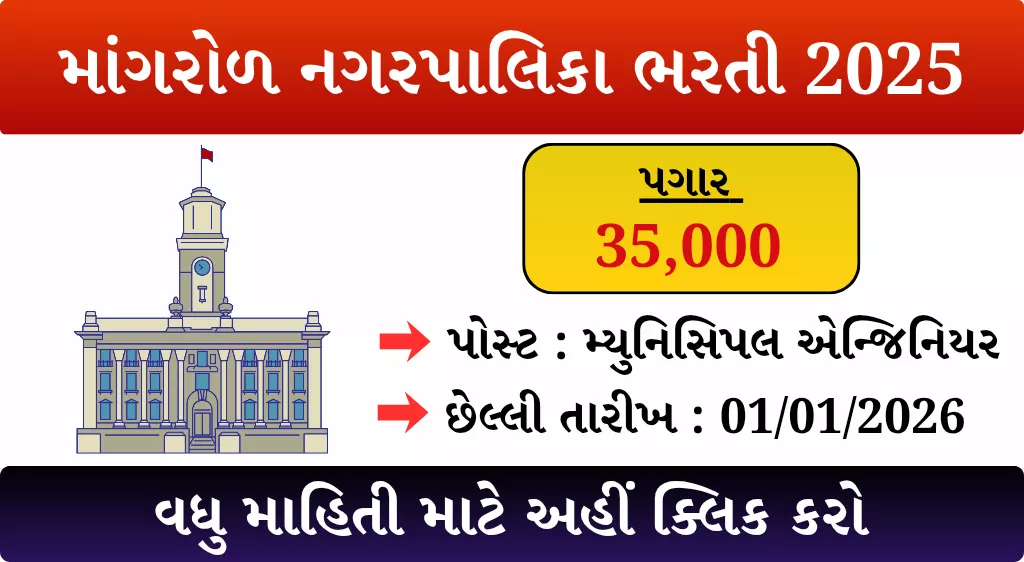 Mangrol Nagarpalika, located in Junagadh district, Gujarat, has released an official recruitment notification for the post of Municipal Engineer (Class-B). This recruitment is being conducted on a contractual basis for 11 months, offering a valuable opportunity for Civil Engineering graduates to work in local government administration.